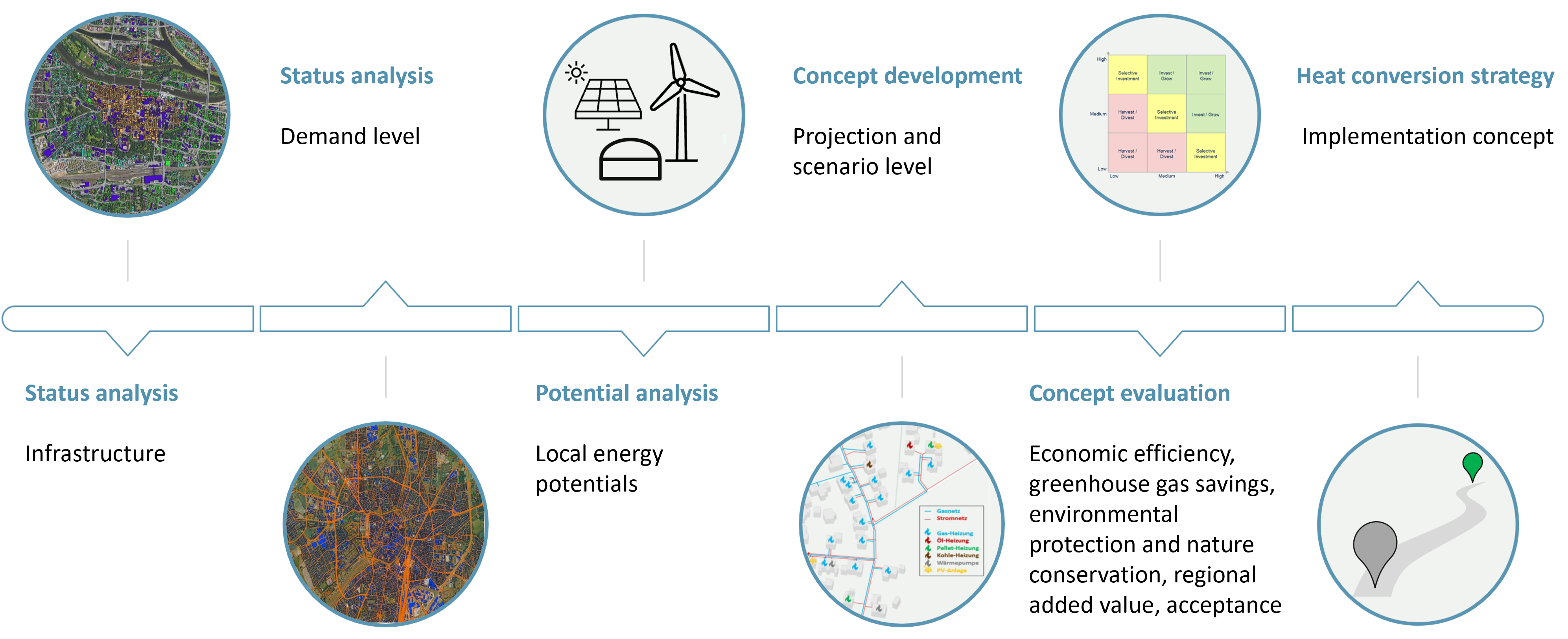 The aim of municipal heat planning is to develop an ecological, economical, and secure heat solution for municipalities as a long-term perspective, keeping an eye on social compatibility and presenting measures and implementation options from the community's perspective. This requires intensive coordination of the necessary transformation processes between the main actors of a municipality, the supply companies, and the local housing industry.