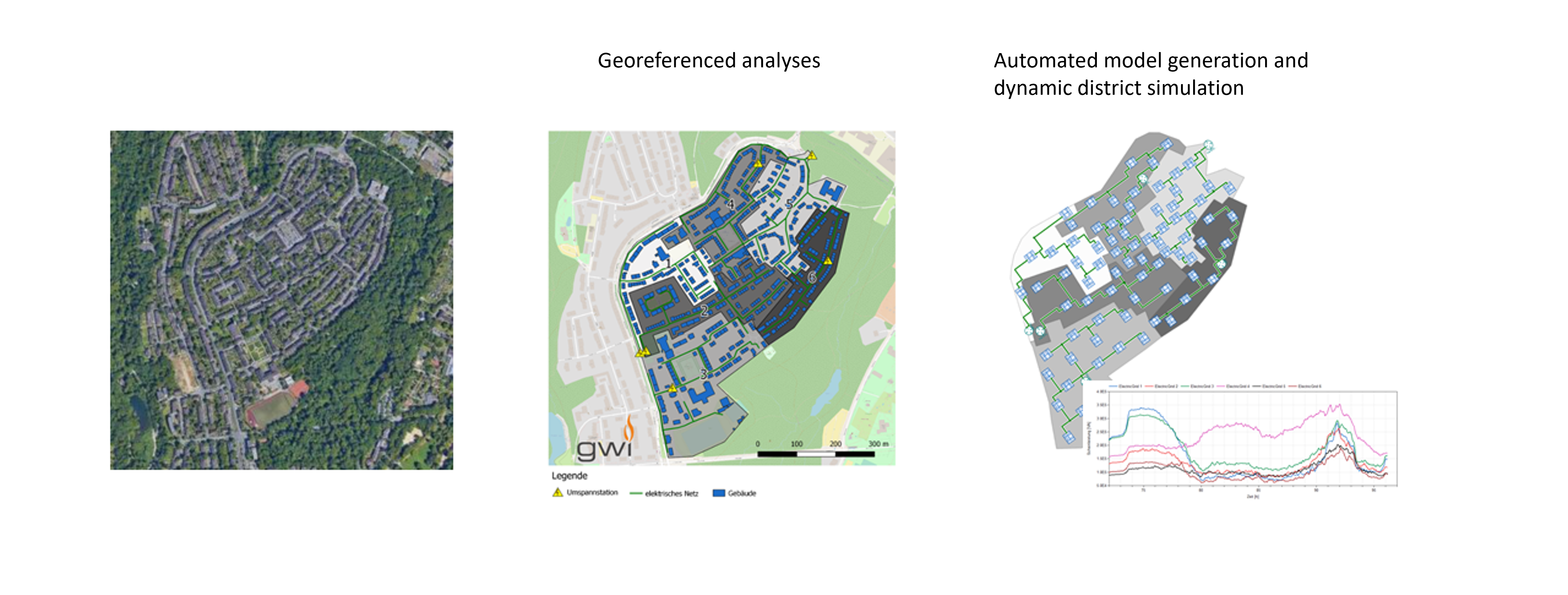 The integration of the individual interacting actors in the energy system of the future (grid and system levels) can be studied at GWI using dynamic simulations in Modelica. Here, detailed georeferenced analyses (GIS analyses) can transfer real energy infrastructures into dynamic neighborhood models (Digital Twin), so that simulations with high spatial and temporal resolution can be carried out. The in-house bottom-up approach makes it possible to examine the multi-directional interactions between consumers, producers, storage, and grids in technology-open path analyses and to develop energy concepts for a climate-neutral transformation of the energy system. The GWI's energy system model allows for considering economic criteria beyond these techno-ecological considerations. These and other criteria are implemented in the individual examination levels of the overall model. The starting points for these examination levels are real settlement structures or synthetic reference typologies.